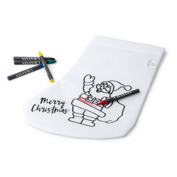 Calcetín elaborado en tejido non-woven en color blanco. Con un divertido diseño navideño para colorear. Se puede colorear con ceras, incluidas con el calcetín, en colores: azul, rojo, negro, amarillo y verde. Además, cuenta con una tira para colgar también en blanco.