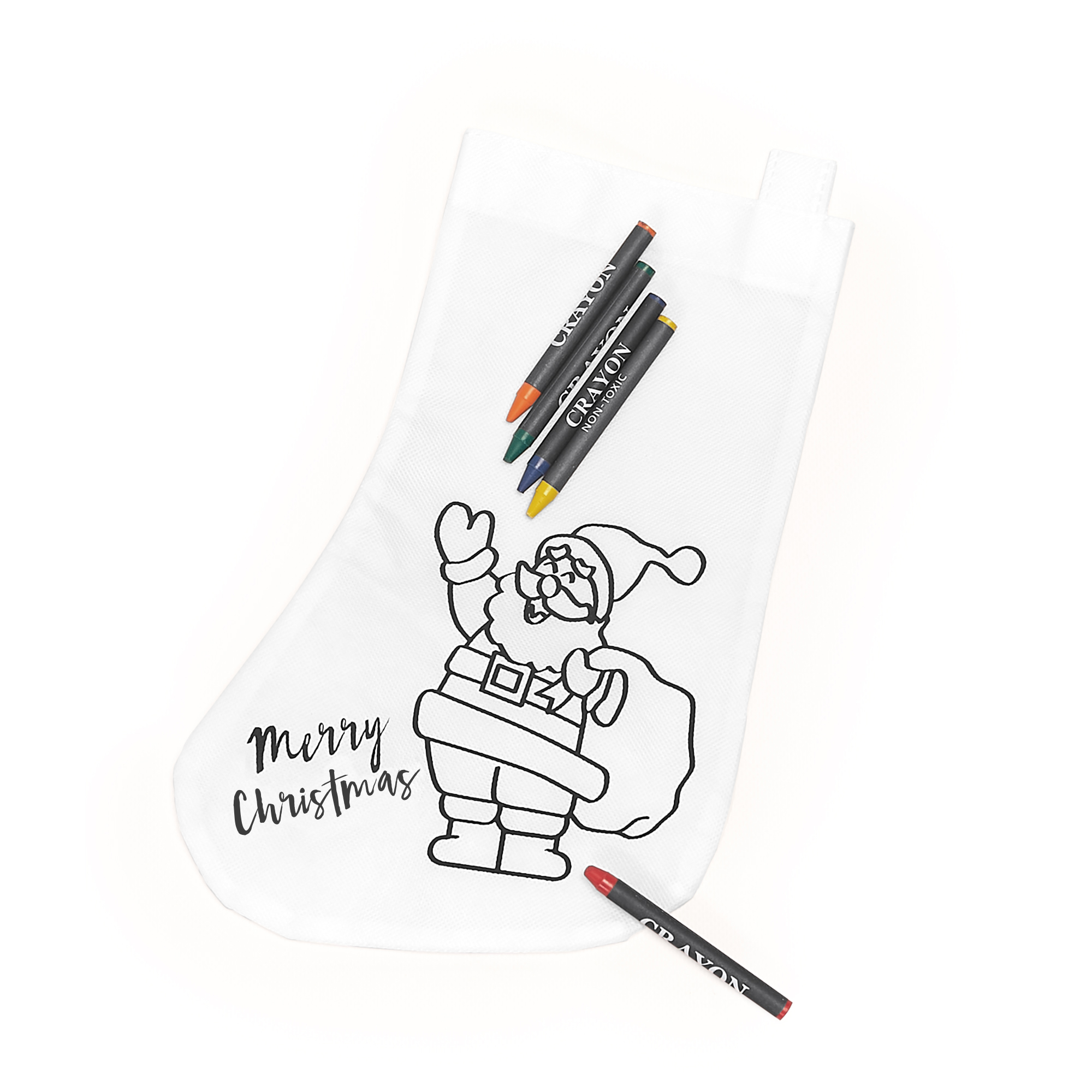 Calcetín elaborado en tejido non-woven en color blanco. Con un divertido diseño navideño para colorear. Se puede colorear con ceras, incluidas con el calcetín, en colores: azul, rojo, negro, amarillo y verde. Además, cuenta con una tira para colgar también en blanco.