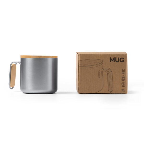 Taza de acero inoxidable 304 reciclado con detalle de bambú en el asa. Capacidad de 350 ml. Incluye tapadera en bambú con aro de silicona para un cierre más seguro y evitar caída de líquidos.