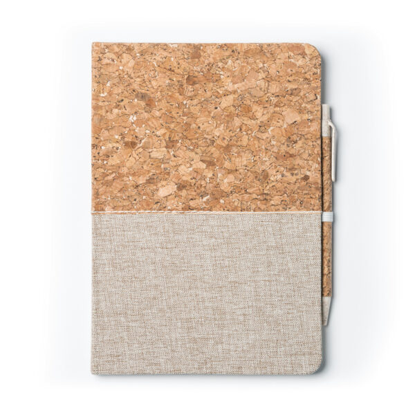 Bloc de notas A5 con tapas rígidas de corcho y algodón. 80 hojas lisas. Incluye soporte con bolígrafo de corcho y fibra de trigo a juego. Composición: Corcho, algodón, fibra de trigo y papel. Observaciones: Tinta azul.