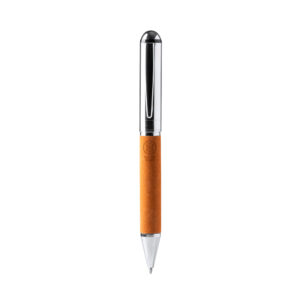 Bolígrafo giratorio con cuerpo realizado en metal y piel reciclada. Tinta azul.Composición: Metal y piel reciclada.Observaciones: Presentación en caja eco. Medidas de la caja presentación: 18×4,1×2,3cm.