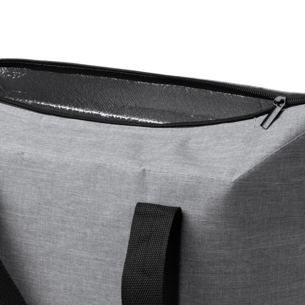 Nevera extensible de políester reciclado RPET de fácil guardado. Cuenta con un compartimento principal con interior isotérmico y asas de mano para un transporte cómodo, además de cierre de cremallera. Cremallera y asas a conjunto en negro.