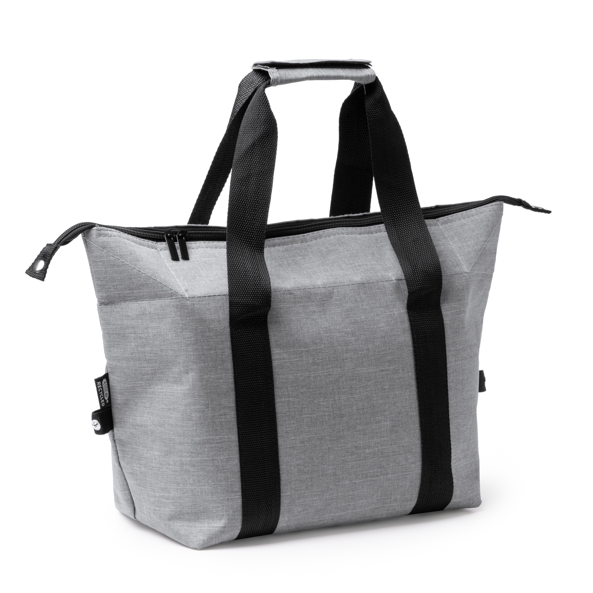 Nevera extensible de políester reciclado RPET de fácil guardado. Cuenta con un compartimento principal con interior isotérmico y asas de mano para un transporte cómodo, además de cierre de cremallera. Cremallera y asas a conjunto en negro.