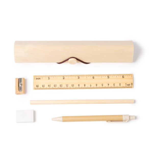 Set de escritura de madera natural presentado en estuche de madera. Incluye los 5 productos fundamentales como: regla, lápiz, bolígrafo de cartón reciclado con pulsador, una goma de borrar y un sacapuntas. Composición: Madera natural