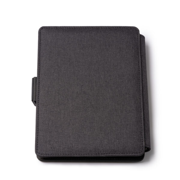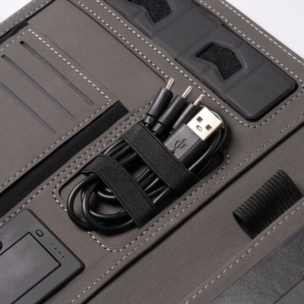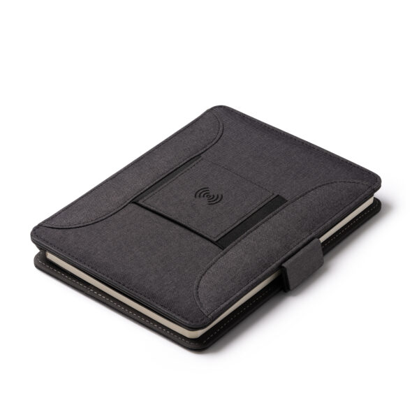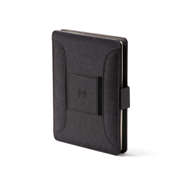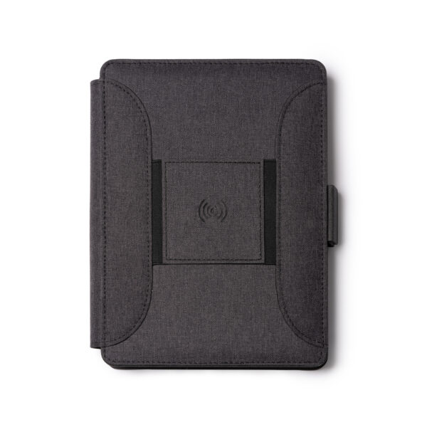 La carpeta A5 multifunción de RPET 300D, con cierre magnético. Cuenta con un cargador inalámbrico incorporado en la tapa, lo que permite cargar dispositivos compatibles con tecnología inalámbrica. En el interior se encuentra un bloc de notas extraíble de 56 hojas y un compartimento para tu móvil. Incluye un tarjetero y un soporte para el móvil, además de un soporte para bolígrafo y un cable con 3 entradas (tipo C y salida USB).