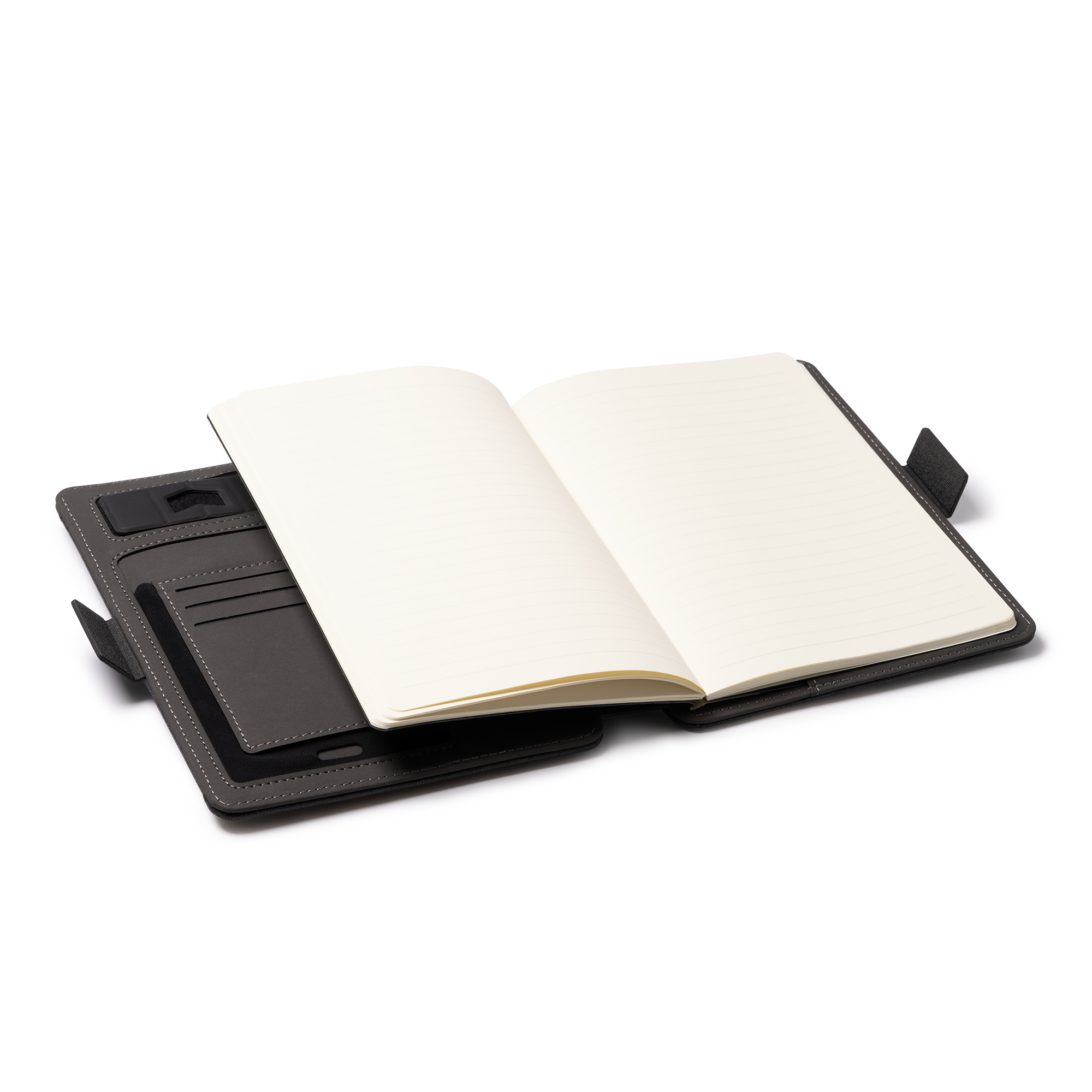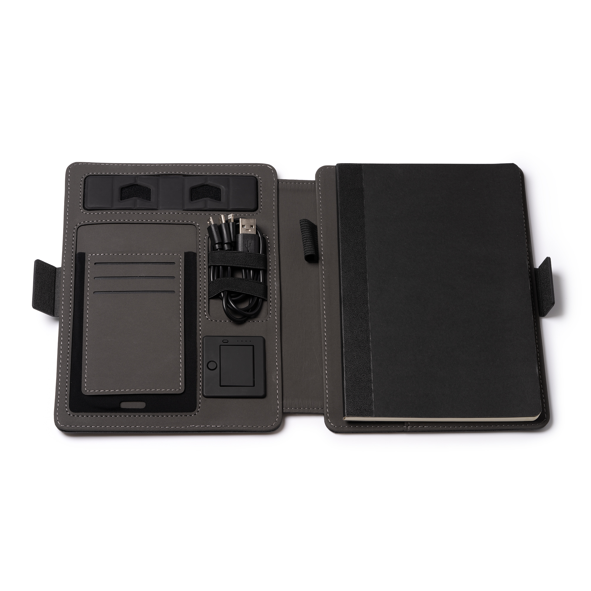 La carpeta A5 multifunción de RPET 300D, con cierre magnético. Cuenta con un cargador inalámbrico incorporado en la tapa, lo que permite cargar dispositivos compatibles con tecnología inalámbrica. En el interior se encuentra un bloc de notas extraíble de 56 hojas y un compartimento para tu móvil. Incluye un tarjetero y un soporte para el móvil, además de un soporte para bolígrafo y un cable con 3 entradas (tipo C y salida USB).
