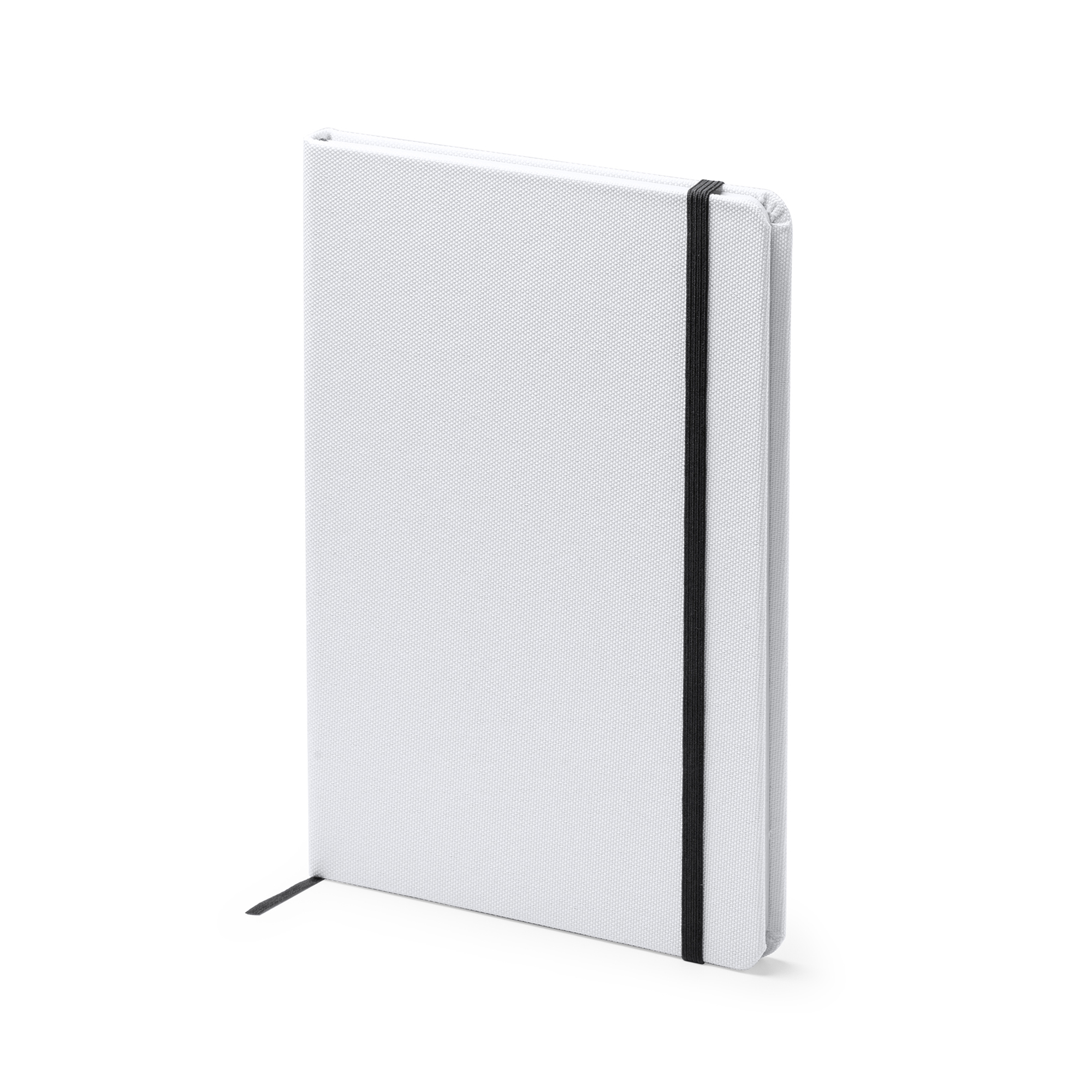 Bloc de notas tamaño A5 ideal para sublimación de tapa rígida. Incluye marcador de páginas y banda elástica de cierre a juego. Contiene con 100 hojas a lisas.