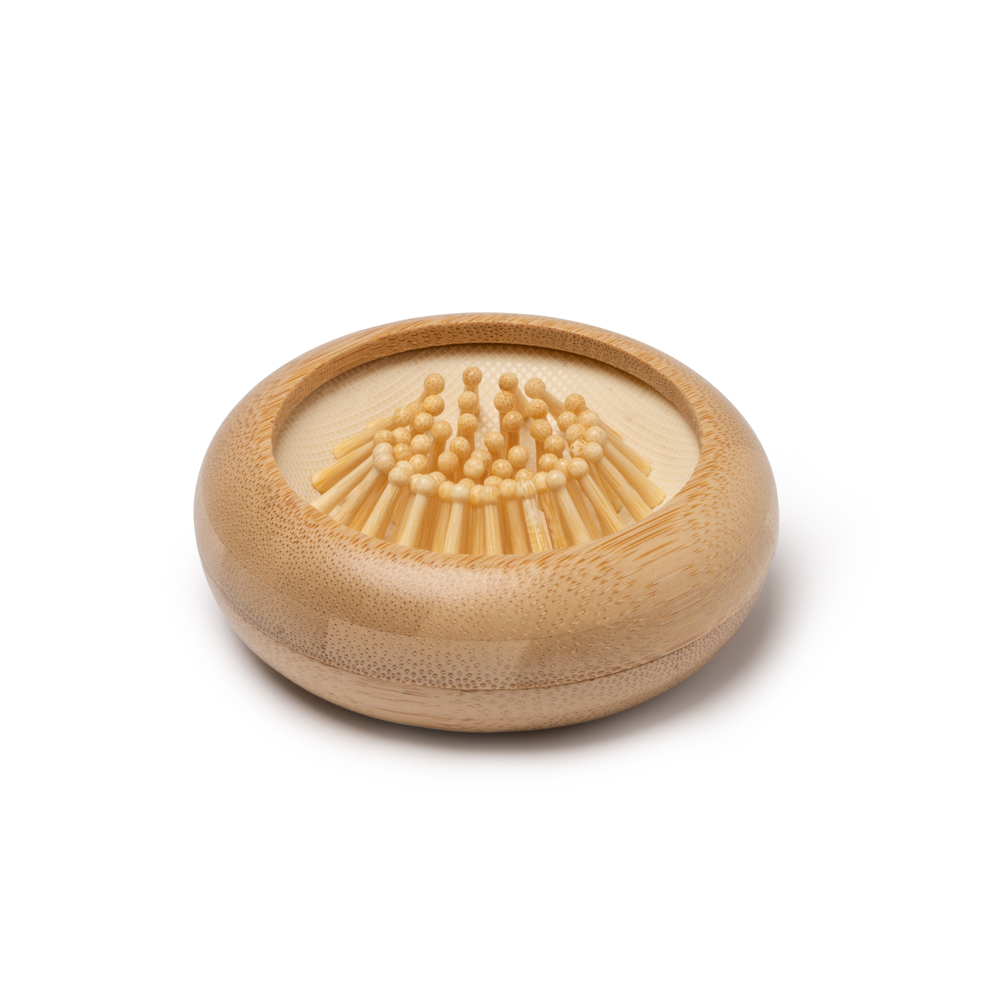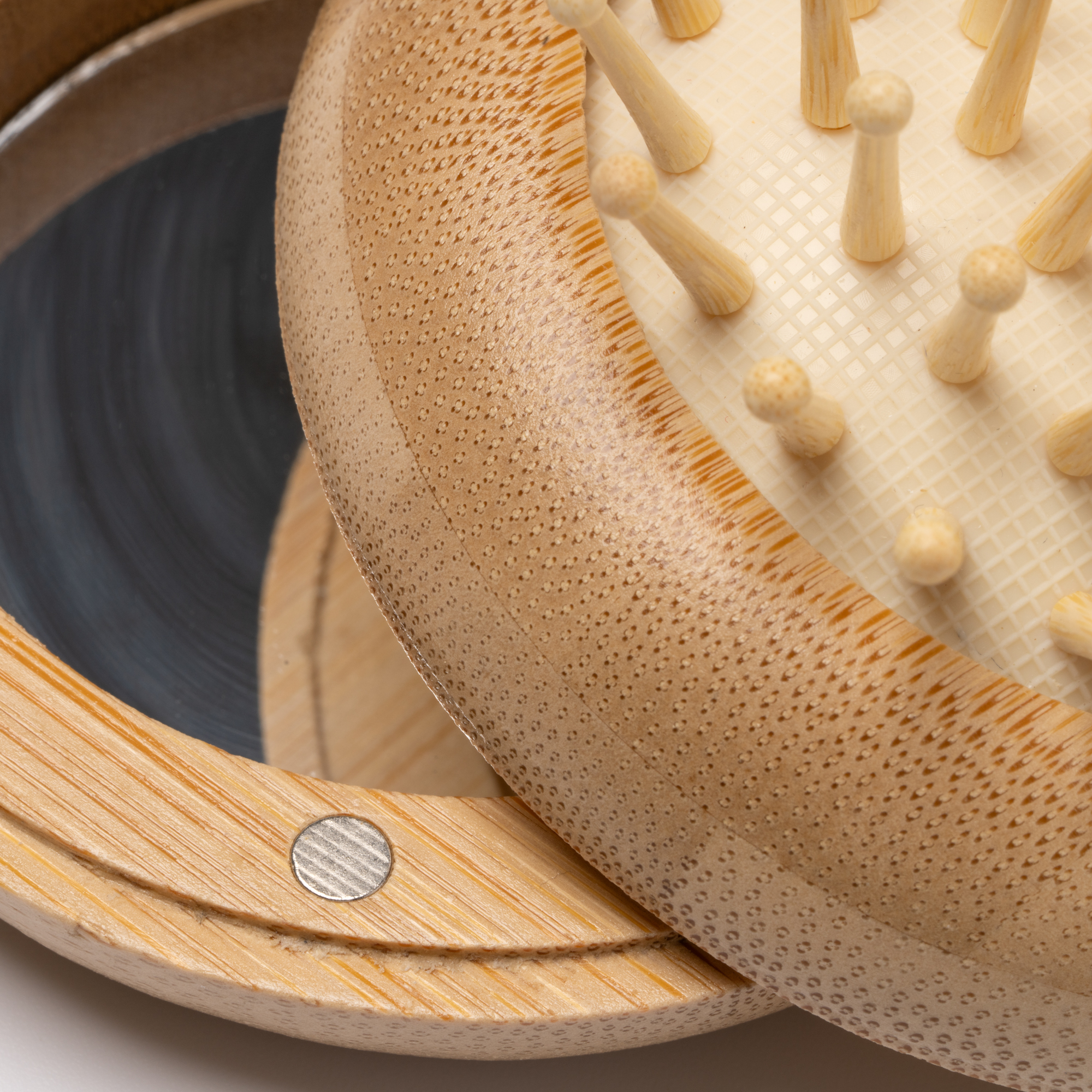Cepillo plegable con cuerpo y cerdas de bambú, con espejo incorporado en la parte trasera mediante imanes, convirtiéndose así en una sola pieza. La parte del cepillo puede desplegarse para su uso o cerrarse de forma compacta para guardarlo. Perfecto para cuidar el cabello de manera práctica y sostenible en cualquier lugar.