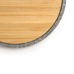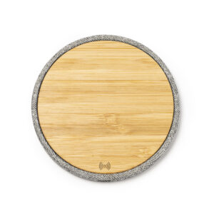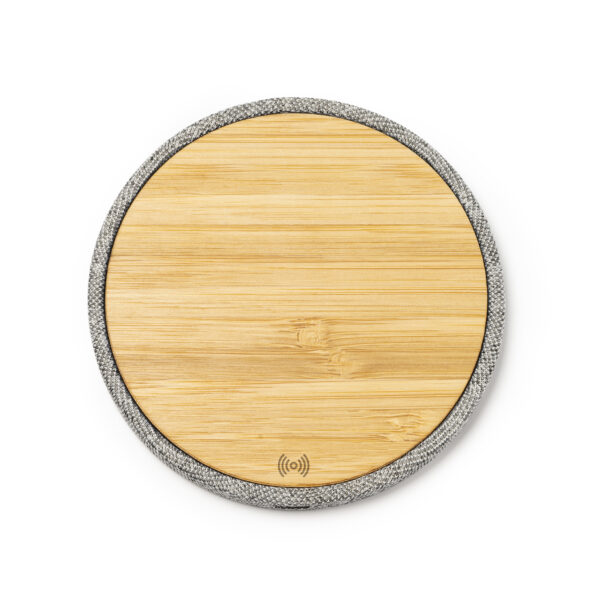 Cargador inalámbrico con cuerpo elaborado en tejido RPET y superficie de carga en bambú. Compatible con dispositivos provistos de tecnología de carga inalámbrica.