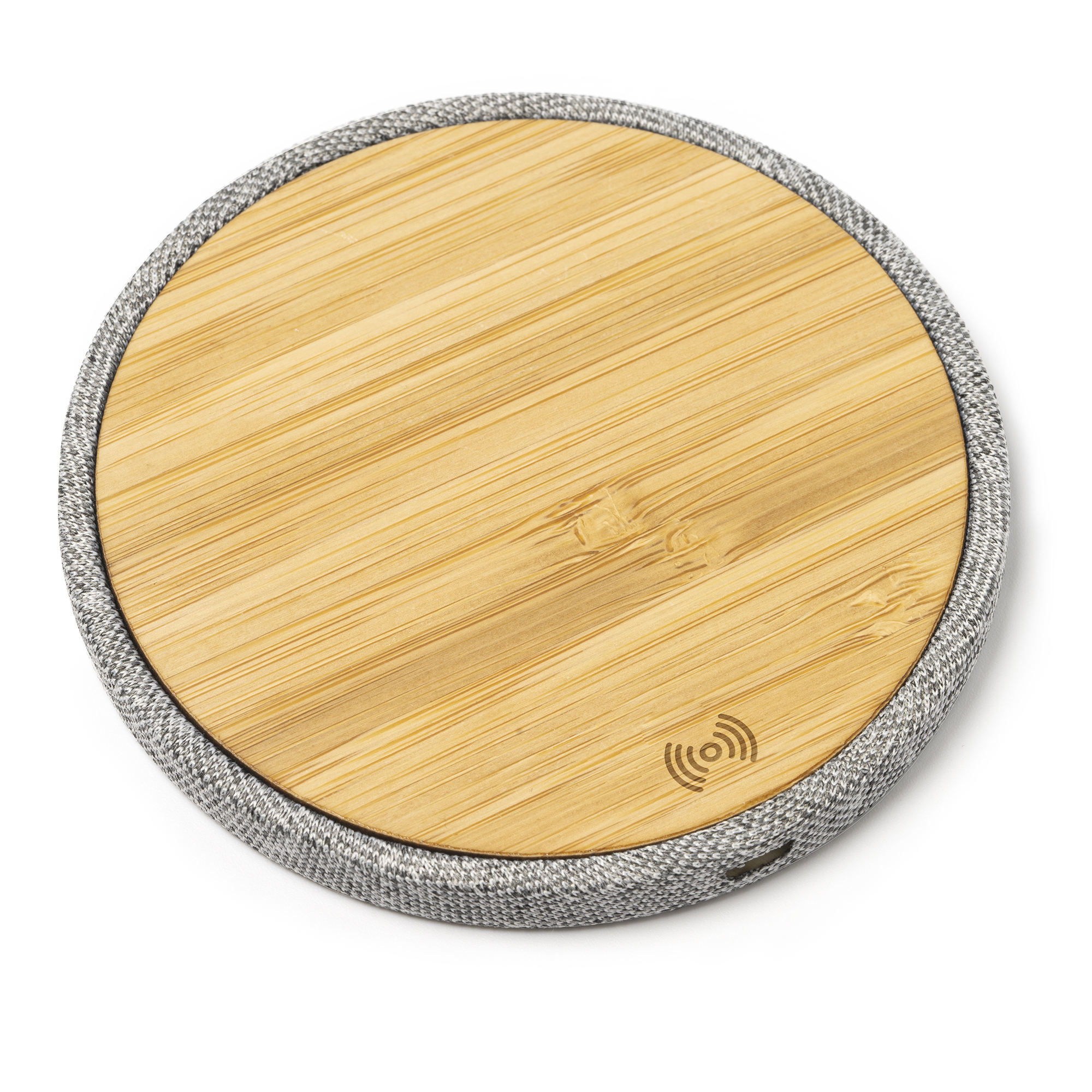 Cargador inalámbrico con cuerpo elaborado en tejido RPET y superficie de carga en bambú. Compatible con dispositivos provistos de tecnología de carga inalámbrica.