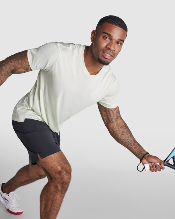 Camiseta técnica manga corta transpirable. Roly Control Dry. Combinación de tejidos ligeros y elásticos en hombros, espalda y paneles laterales. Cuello cruzado redondo y cubrecosturas del mismo tejido al tono. Costuras adelantadas. Certificado GRS.