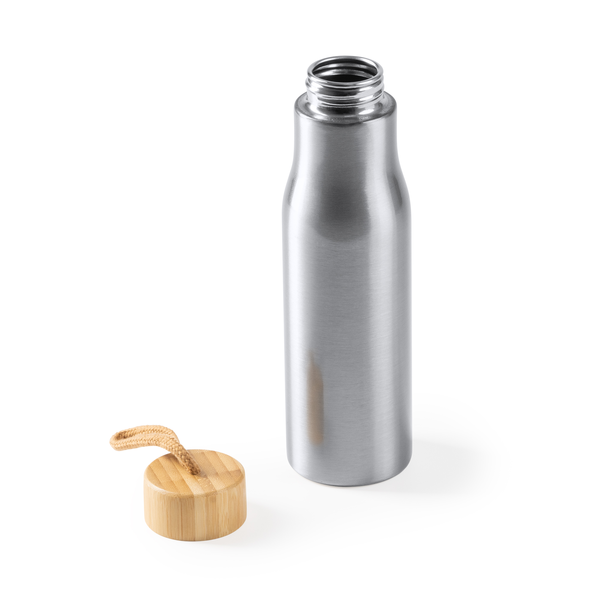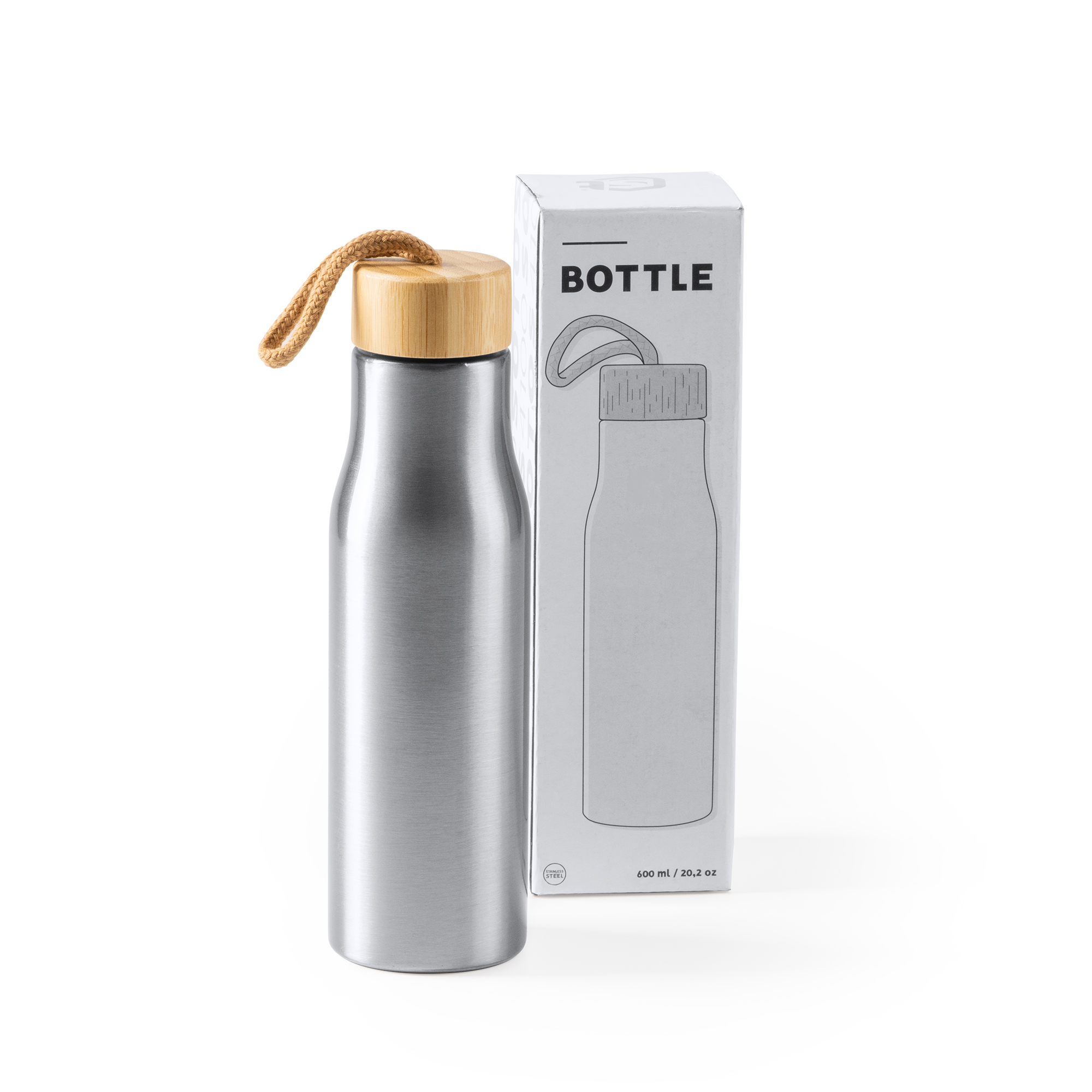 Bidón con cuerpo elaborado en acero inoxidable 304 con tapón de bambú, que incluye cinta para transporte. Con 600 ml de capacidad. Promociona tu empresa con el bidón Sotos.