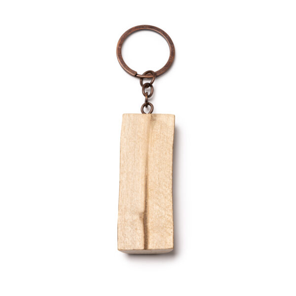 Llavero tronco de madera con hendidura. Anilla metálica.