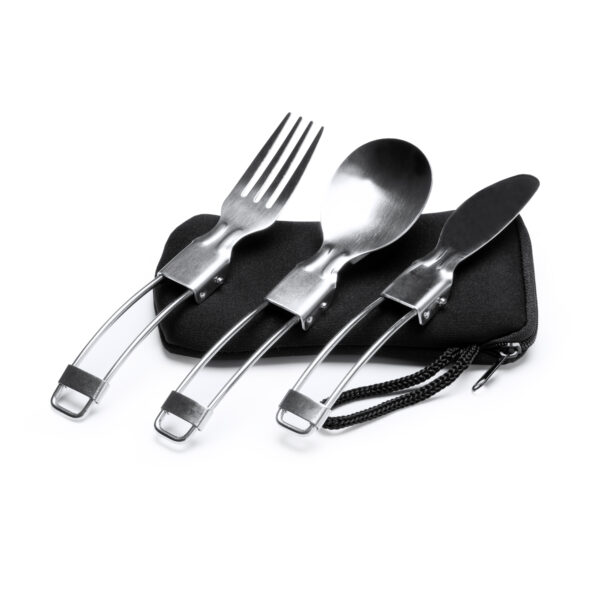 Set de cubiertos plegables de acero inoxidable con práctica funda de neopreno con cierre de cremallera y con asa para transporte. Incluye tenedor, cuchillo y cuchara.