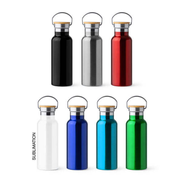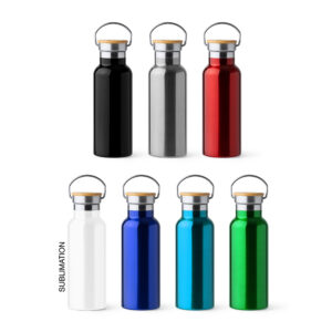 Bidón de acero inoxidable 304 doble pared con tapa de bambú. Capacidad 500 ml. Posibilidad de realizar sublimación sobre el color blanco. Asa metálica plegable. Disponible en una gran variedad de colores.