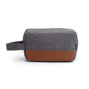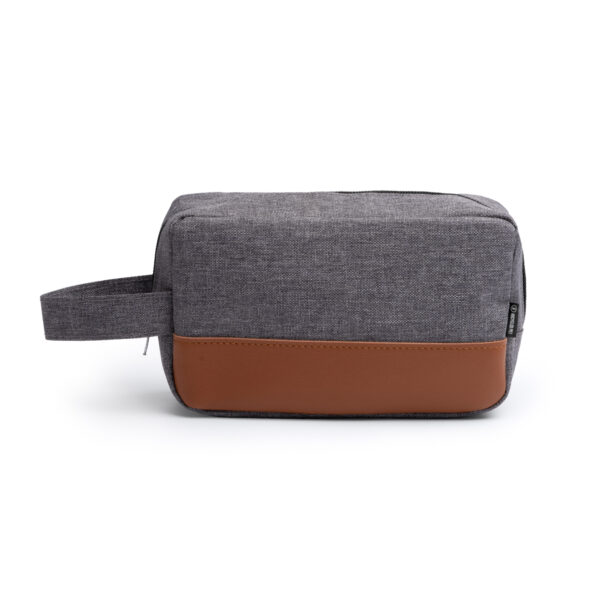 Neceser de poliéster reciclado RPET con detalles en PU Leather, ideal para marcaje. Incluye asa para transporte, combinando sostenibilidad y estilo. Transporta tus enseres de manerá cómoda y elegante.
