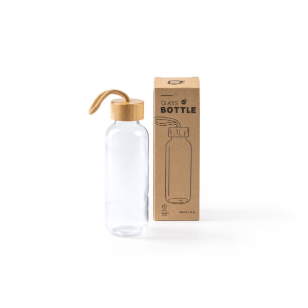 Bidón de cristal de 450 ml con un distinguido tapón de bambú, y cinta de transporte en acabado natural. Composición: Cuerpo: Cristal. Tapón: Bambú.Observaciones: Anti goteo. Presentación en caja diseño.