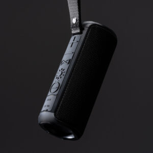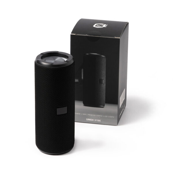 Altavoz inalámbrico de diseño con acabado tejido premium y potencia de 10W. Con membrana transparente con 6 modos de luz led. Incluye resistente asa de transporte y placa especial para marcaje láser. Batería recargable. Función de manos libres, con micrófono incorporado y control de llamadas mediante botones multifunción.