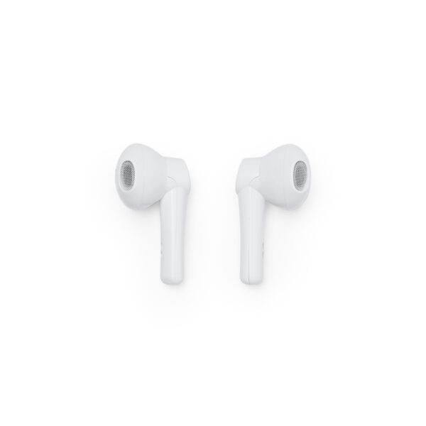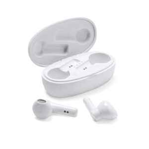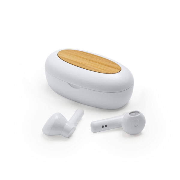 Auriculares inalámbricos presentado en estuche elaborado en material reciclado y detalles en bambú en la superficie. Con control de reproducción de audio, con funciones de control de volumen, pista siguiente. También cuenta con función de manos libres y asistente de voz mediante botón multifunción táctil de ambos auriculares. Incluye indicador luminoso en ambos auriculares e indicador luminoso en el estuche de carga.