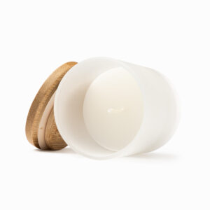 Vela aromática en vaso de cristal translucido con tapa de bambú, que ayuda a mantener el aroma de la vela cuando no está en uso. Aroma vainilla.