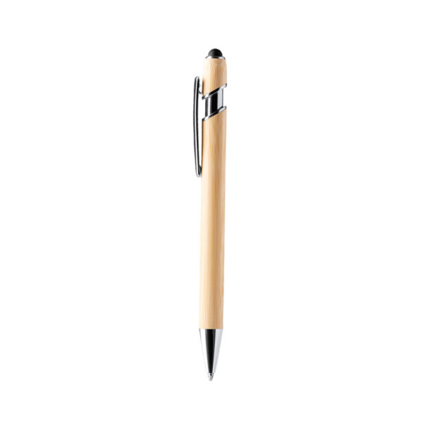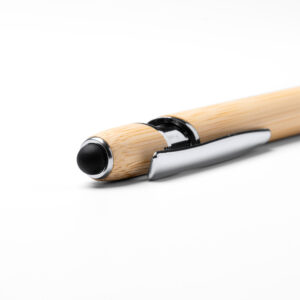 Bolígrafo con cuerpo elaborado en bambú y pulsador en acabado metálico. Con puntero táctil incorporado y mecanismo pulsador. Tinta azul.Composición: Bambú