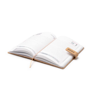 Agenda tamaño A5 realizada con corcho y cubierta magnética. Contiene 320 páginas más 4 páginas con mapas. Incluye marcador de páginas a juego con la portada. Papel interior blanco con impresión a color 2+2. Ideal para una organización elegante y práctica.