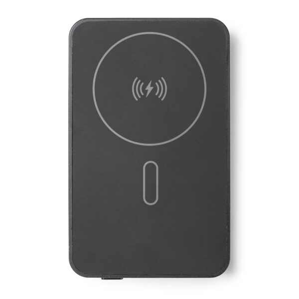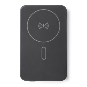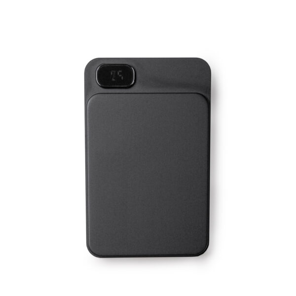 Batería externa magnética de 10000 mAh con cuerpo de aluminio reciclado. Con función de carga inalámbrica para dispositivos provistos de esta tecnología. Pantalla LED con indicador de porcentaje de carga. Puerto Tipo C de entrada y salida. Salida corriente 15W. Incluye cable tipo C y anillo magnético.