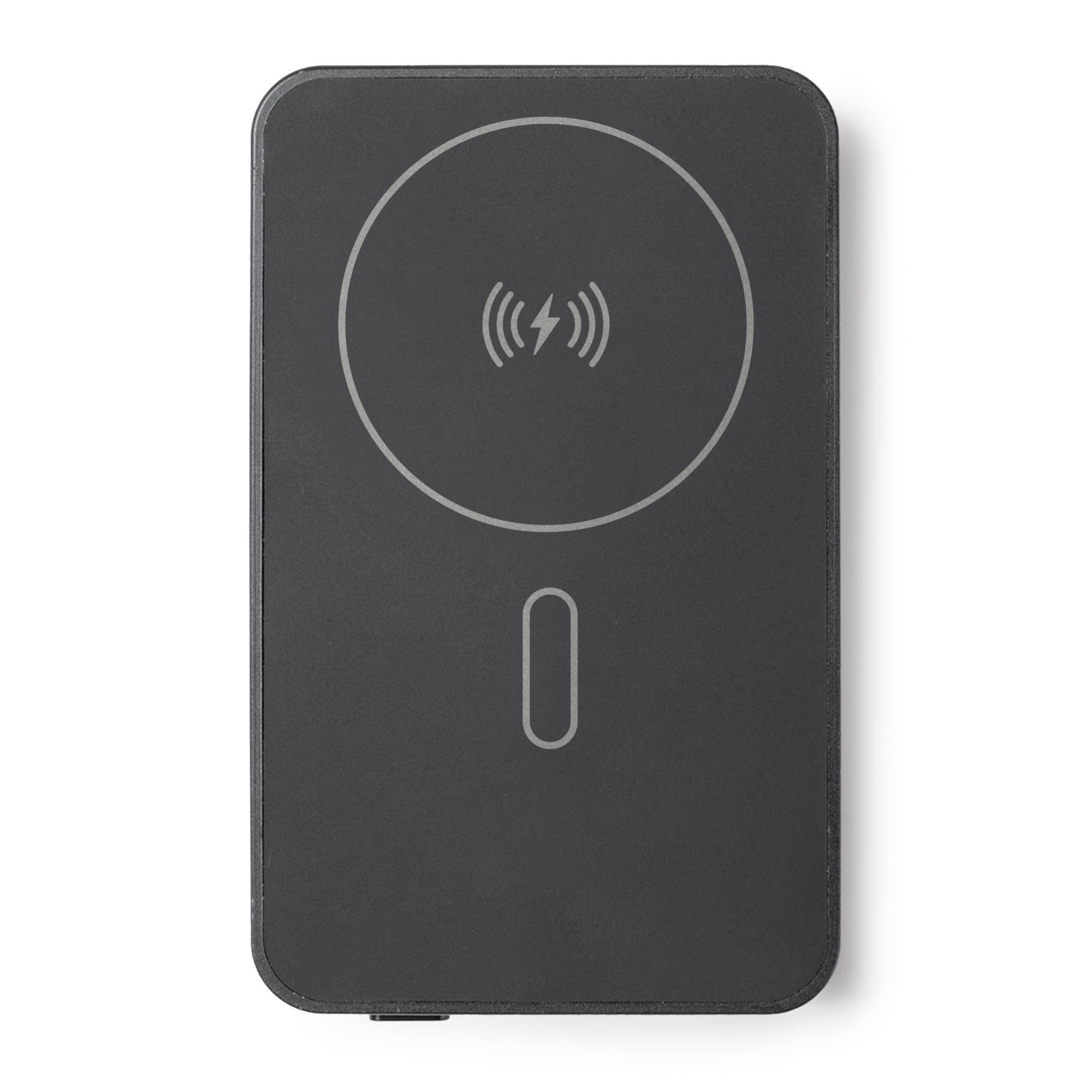 Batería externa magnética de 10000 mAh con cuerpo de aluminio reciclado. Con función de carga inalámbrica para dispositivos provistos de esta tecnología. Pantalla LED con indicador de porcentaje de carga. Puerto Tipo C de entrada y salida. Salida corriente 15W. Incluye cable tipo C y anillo magnético.