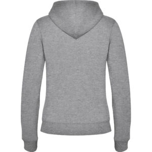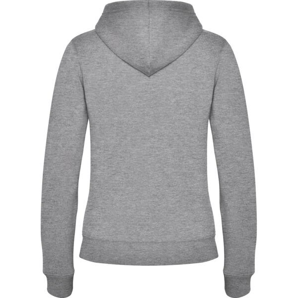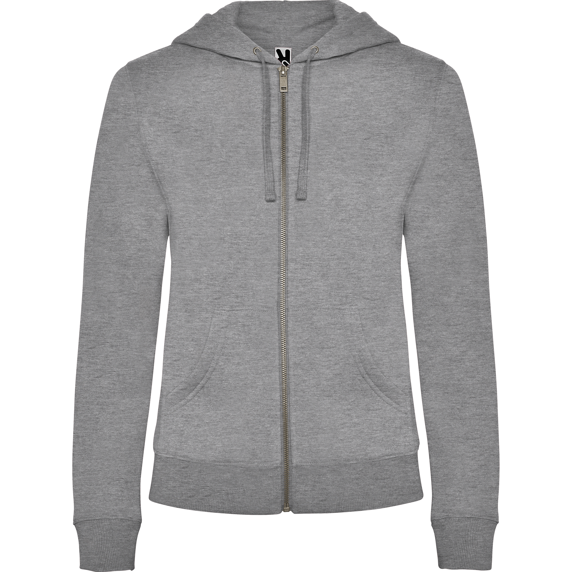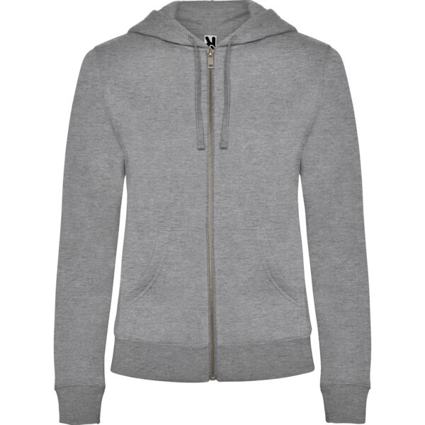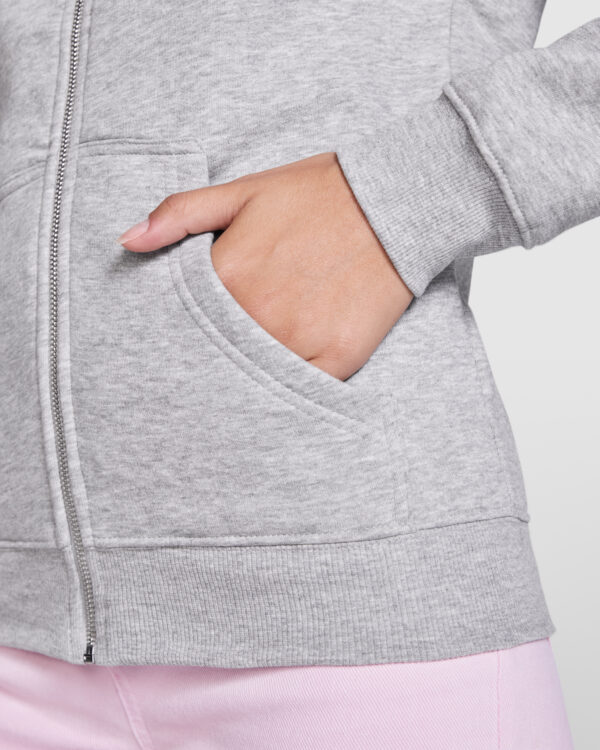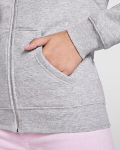 Sudadera entallada en cintura con cremallera frontal y capucha. Cremallera metálica. Bolsillos canguro, puños y cinturilla en canalé 2×1 con elastano. Cordón plano al tono en capucha. Cubrecosturas del mismo tejido.
