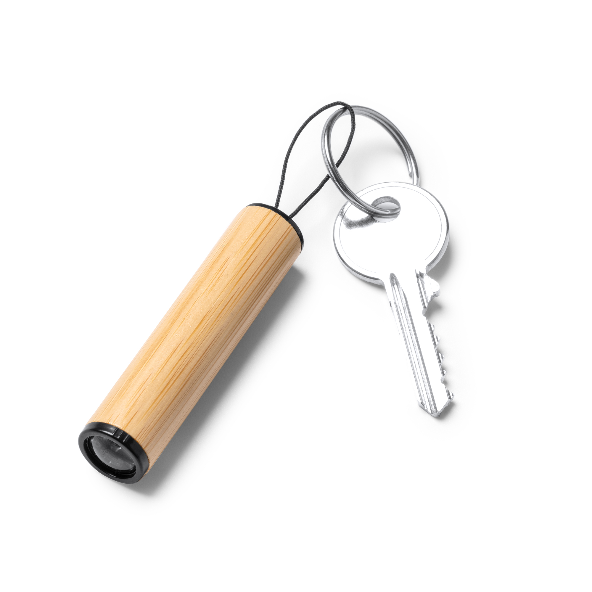Llavero linterna con cuerpo elaborado en bambú, práctico, elegante y sostenible. Su diseño compacto y ligero que lo hace ideal para llevar en el bolsillo o colgarlo junto a las llaves. Incorpora una linterna LED que proporciona una iluminación brillante en situaciones de poca luz. Además, se incluyen tres pilas de botón LR41, lo que garantiza un uso inmediato.