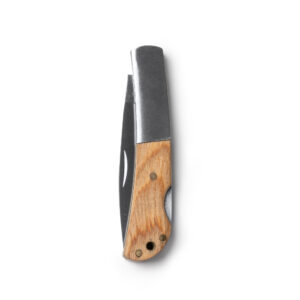 Navaja de acero inoxidable y empuñadura combinada con madera natural. Sistema de seguridad. Composición: Acero inoxidable y madera naturalObservaciones: Medida de la hoja: 7 x 1.3 cm Presentación en caja diseño eco.