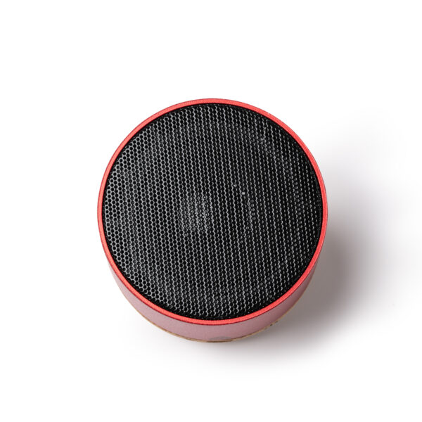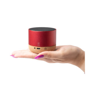 Altavoz inalámbrico fabricado en aluminio reciclado y base de corcho. Con potencia de 3W y batería recargable de 300mAh. Tiempo máximo de reproducción continua de hasta 3 horas.Salida de audio mediante conexión Bluetooth. Cuenta con botón multifunción en la parte trasera e indicador luminoso de carga.