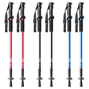 Set de bastones de trekking plegables en aluminio con sistema de amortiguación. Agarre ergonómico y cinta de seguridad ajustable. Incluye accesorio para nieve. Superficie de contacto con el suelo reforzada.