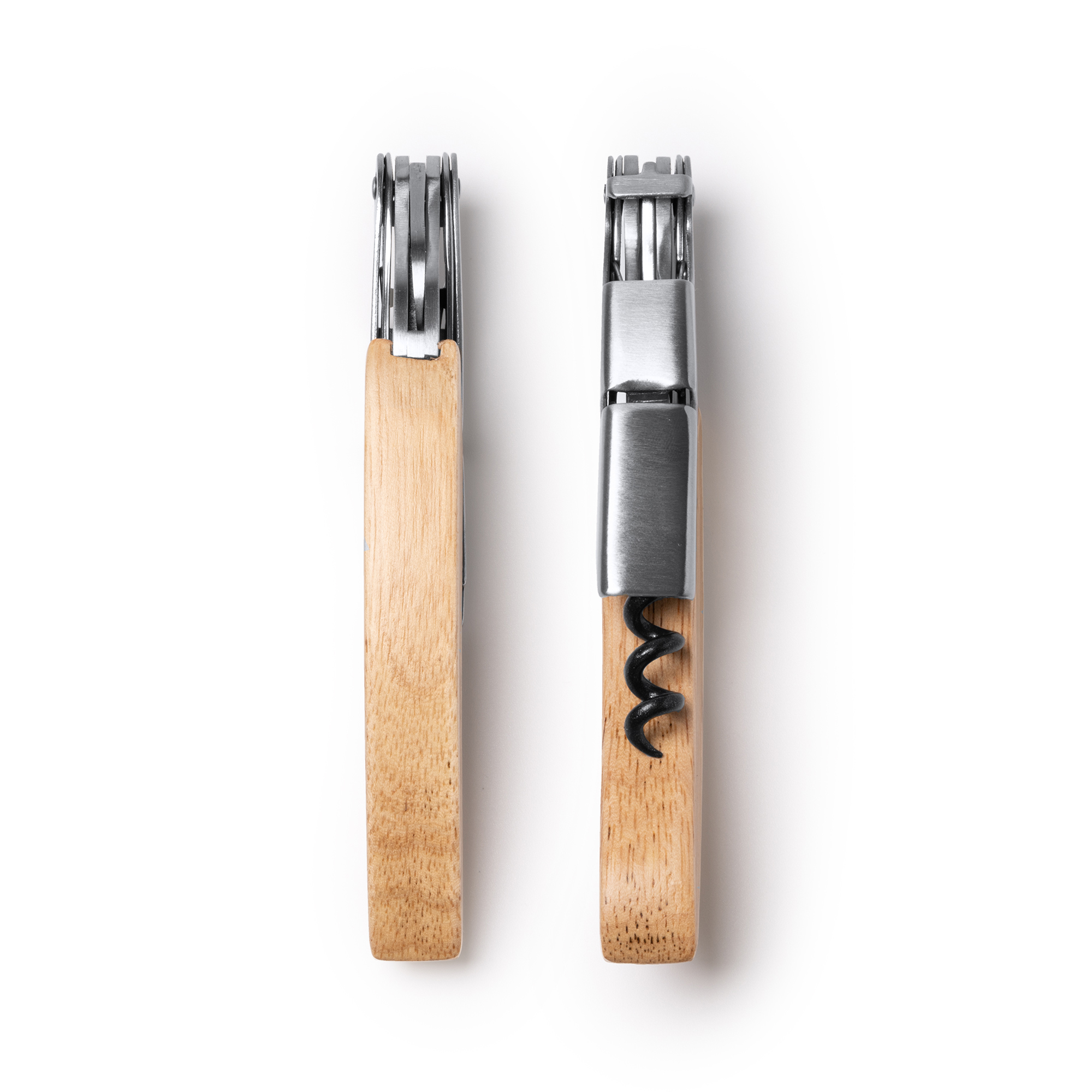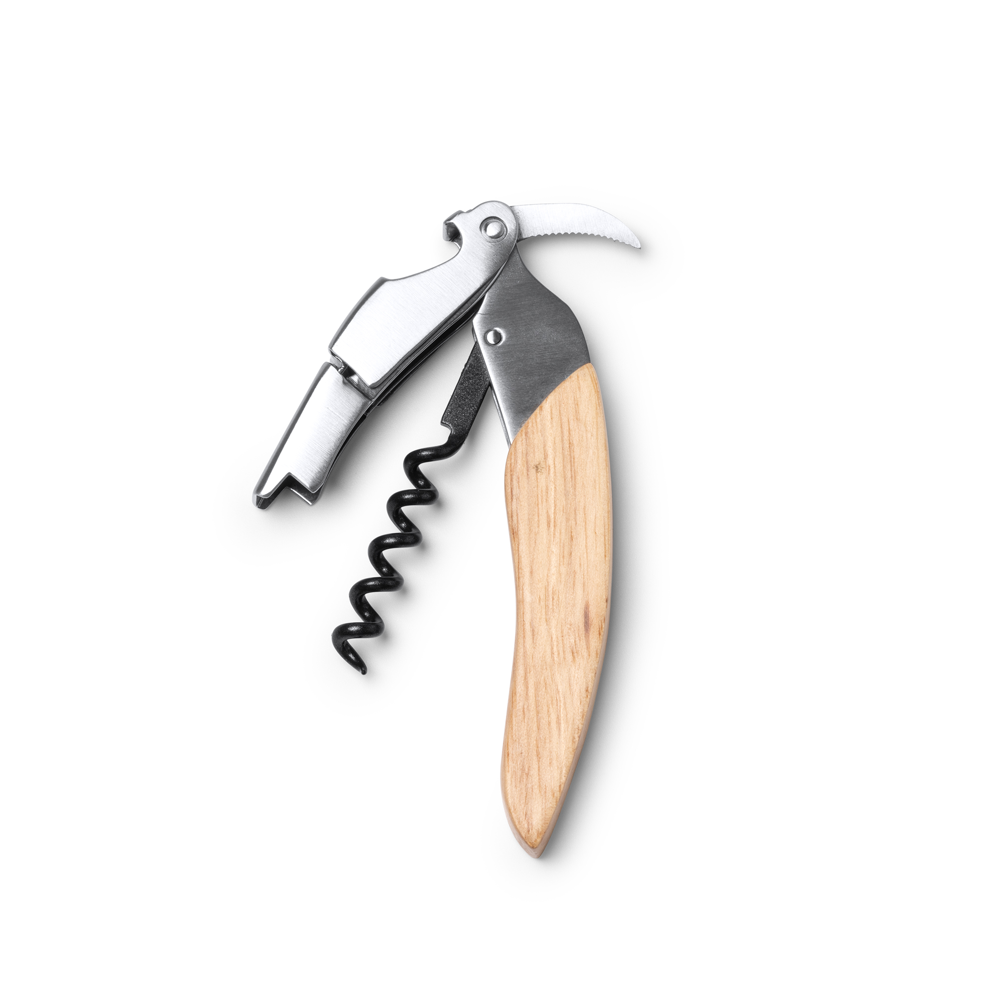 Sacacorchos de acero inoxidable estilo clásico con mango en madera, ofrece elegancia y funcionalidad con un agarre cómodo y seguro. Con mecanismo de doble palanca facilita el proceso de apertura, minimizando el esfuerzo requerido.