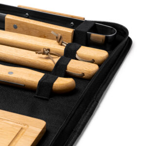 Set para barbacoa con 4 accesorios elaborados en acero inoxidable con mango de madera: cuchillo, trinchador, pinzas, espátula, además de una tabla de cortar en madera que le da a este set mayor versatilidad y funcionalidad. Cuenta con una funda elaborada en poliéster reciclado que hace más fácil su transporte, manteniendo todos los accesorios protegidos gracias al sistema de sujeción individual.
