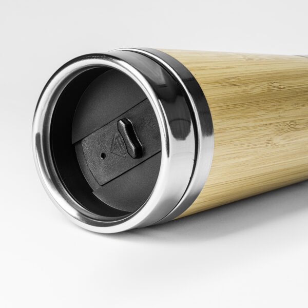 Vaso de acero inoxidable 304 con pared exterior de bambú. Capacidad de 500 ml con tapa dosificador. El vaso perfecto para promocionar tu negocio, sin olvidarte de la naturaleza.