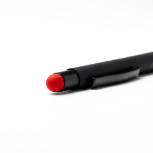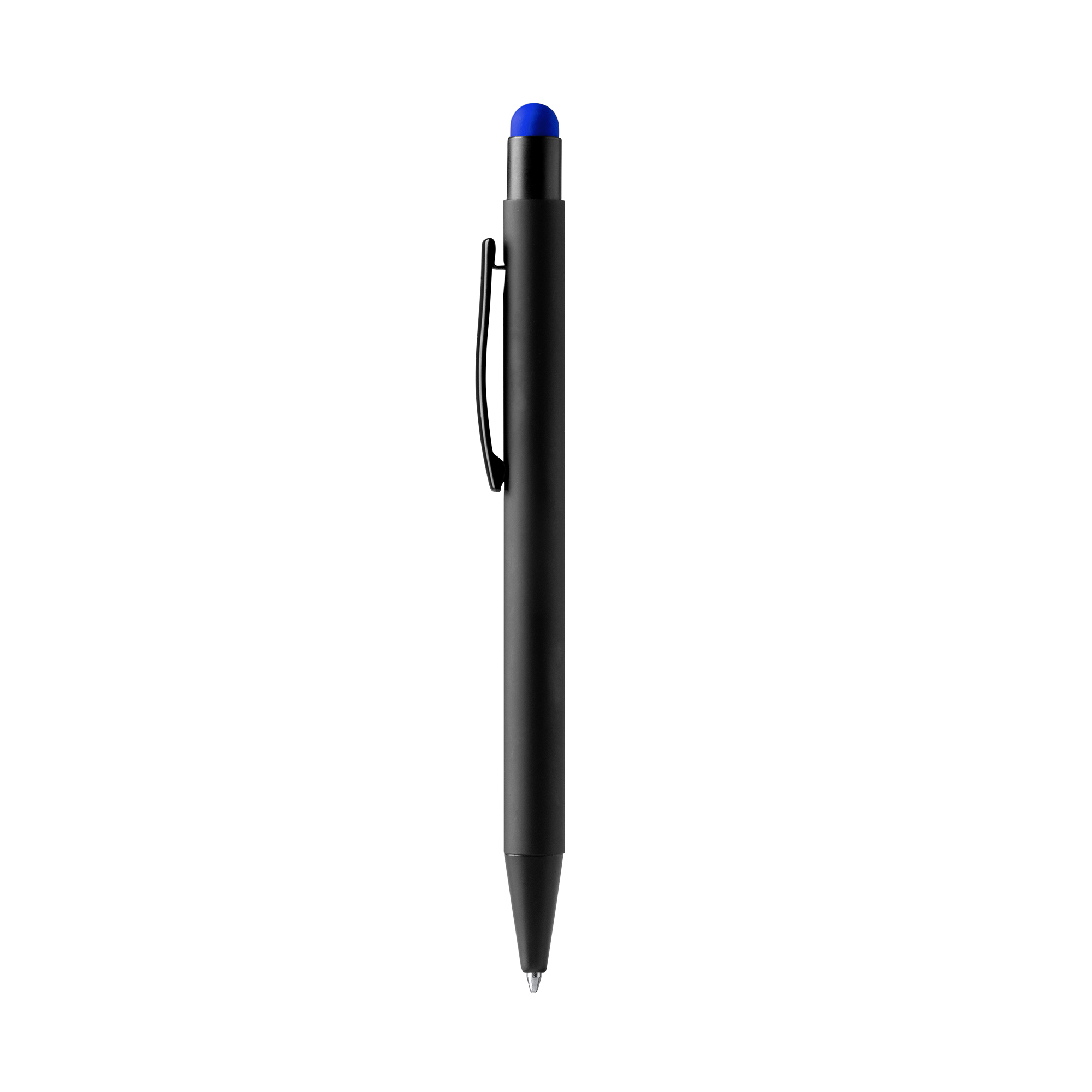 Bolígrafo metálico con acabado de textura suave. Cuenta con puntero táctil en color. Especial para el marcaje en láser. Carga jumbo de tinta azul. Observaciones: Marcado a láser a tono con el color del puntero.